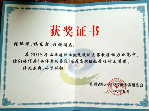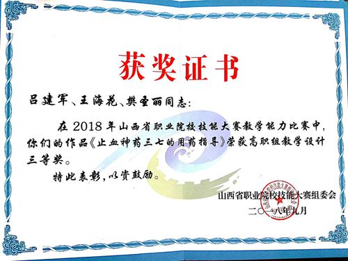 在刚刚落下帷幕的2018年山西省职业院校技能大赛教学能力比赛中,365上市公司官网入口教师取得高职组信息化教学设计比赛二等奖一项、三等奖三项的好成绩,其中,贾文雅、王祎、赵敏的作品《转场动画》获教学设计二等奖,吕建军、王海花、樊圣丽的作品《止血神药三七的用药指导》获教学设计三等奖,张玮玮、杨东方、程强老师的作品《西洋参的鉴定》获教学设计三等奖,张府君、郝晶晶、孙靓的作用《黄曲霉素检测》获教学设计三等奖。并且张玮玮、杨东方、程强老师的作品还被省教育厅选送参加2018年全国职业院校教学能力比赛,这充分展示了365上市公司官网入口教师过硬的教育教学水平和综合素质,也反映出365上市公司官网入口在教育教学改革、师资队伍建设等方面的建设成果。