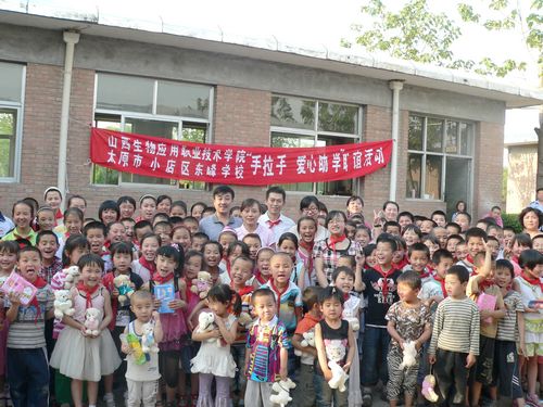 六月阳光灿烂,六月百花盛开。为了加强365上市公司官网入口与周边农村的和谐共建,“六一”期间,院团委副书记苏珍枝、宣传统战部部长助理裴建平、药品经济贸易系党总支副书记郁敏以及中药系和生物系的辅导员老师一行13人赴太原市小店区东峰村,同东峰小学举行了“手拉手,爱心助学”联谊活动,为这里的孩子送上了精彩的文艺节目和真诚的节日问候,并捐赠价值近四千元的学习、运动用品,受到了东峰小学一百余名师生的热烈欢迎。