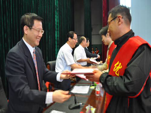 庆祝大会在庄严雄壮的《国歌》声中拉开帷幕。会议首先由院党委副书记、纪委书记龚晋文同志宣读了《关于表彰2009—2010学年优秀教师、优秀班主任和“三育人”先进个人的决定》,大会对裴慧荣等15名优秀教师、程永杰等6名班主任、王祎等7名“三育人”先进个人进行了表彰。随后,局领导、院领导为身披绶带受表彰的人员进行了颁奖。