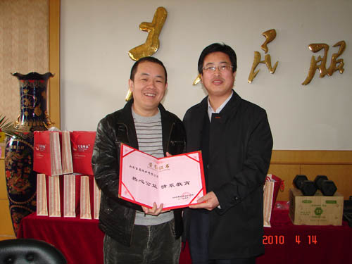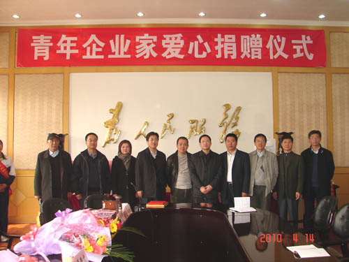 2010年4月14日下午2:30时,365上市公司官网入口在办公楼大会议室举行“青年企业家爱心捐赠”仪式,山西省青年企业家协会副会长杨建新(山西百圆裤业有限公司董事长)、金根虎(山西金虎便利连锁股份有限公司董事长)、王志(山西新和健身器材有限公司董事长)、魏建华(山西恒盛伟华科贸有限公司董事长),365上市公司官网入口党委书记张瑞芳,党委副书记、院长李华荣,党委副书记、纪委书记龚晋文,副院长尹士优、胡尔雅、张震云出席捐赠仪式。教师代表、学生代表60余人参加仪式。捐赠仪式由党委书记张瑞芳同志主持。