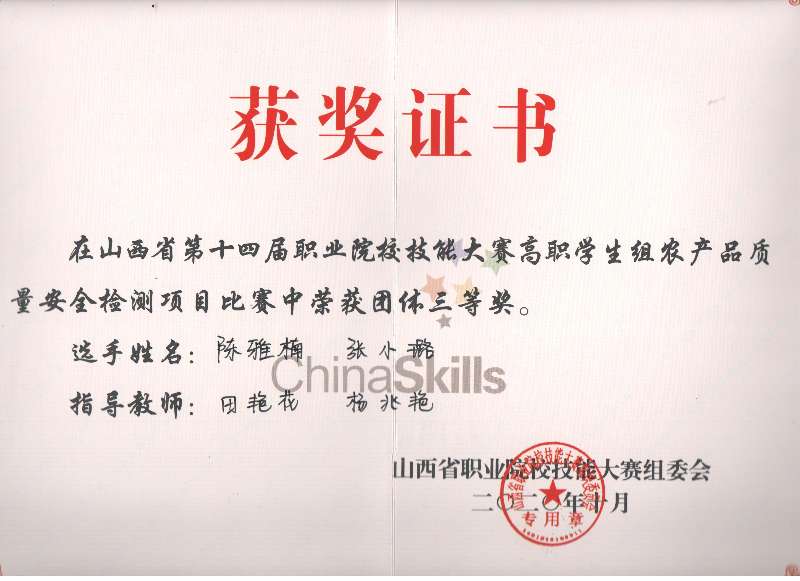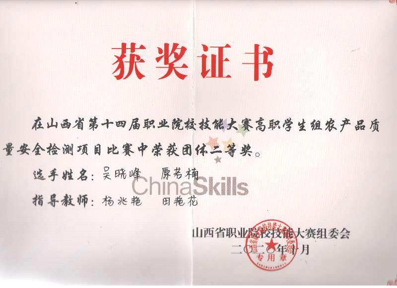 在刚刚落下帷幕的2020年山西省第十四届职业院校技能大赛农产品质量安全检测大赛中,365上市公司官网入口食品工程系学生吴晓峰和原若楠荣获团体二等奖、陈雅楠和张小璐荣获团体三等奖,杨兆艳、田艳花获优秀指导教师称号。