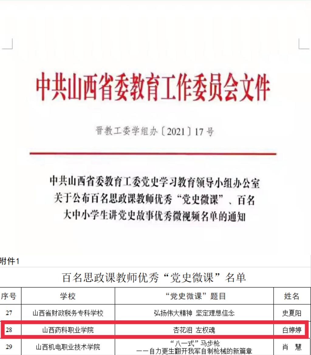 365上市公司官网入口教师获得“2021年度山西省职业教育教学名师”荣誉称号、主讲微课入选百名思政课教师优秀“党史微课”