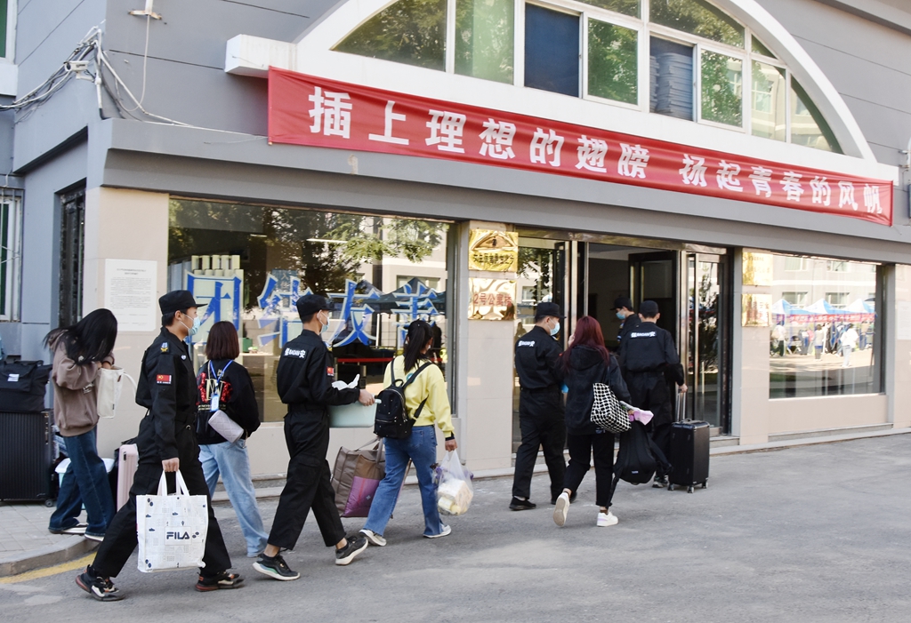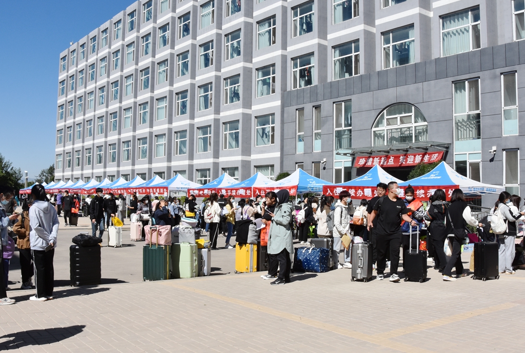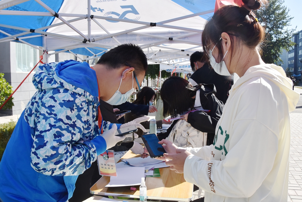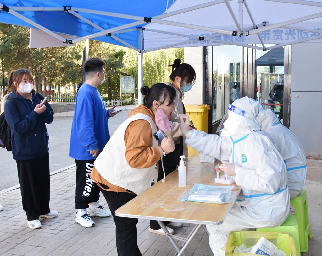 入校核酸检测是新生报到的最后一道关卡,宿舍楼前的大白们全副武装、严阵以待,为学生把好最后一道关。