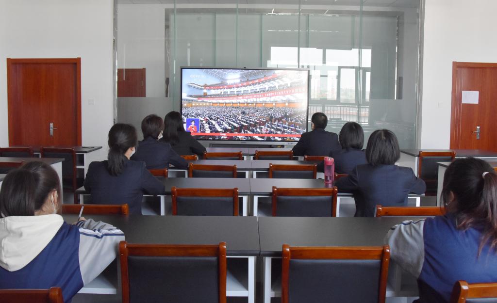 院党委书记王旭说:习近平总书记代表中共第十九届中央委员会向党的二十大所作的报告,是一篇闪耀着马克思主义真理光辉的纲领性文献,是谱写全面建设社会主义现代化国家新篇章、夺取中国特色社会主义新胜利的行动指南。报告明确宣示了党在新征程上举什么旗、走什么路、以什么样的精神状态、朝着什么样的目标继续前进,顺应全党全国各族人民共同心愿,符合新时代中国特色社会主义发展要求,适应党和国家工作新形势新任务。奋进新征程,建功新时代,要以党的二十大精神为指引,以习近平新时代中国特色社会主义思想为统领,大力弘扬伟大建党精神,落实全面从严治党和新时期党的建设总要求,深刻领悟“两个确立”的决定性意义,不断增强“四个意识”、坚定“四个自信”、做到“两个维护”,切实把思想和行动统一到大会各项决策部署上来,全面贯彻党的教育方针,牢记“为党育人、为国育才”使命任务,把握新时代职业教育改革发展新机遇,遵循职业教育办学规律和人才成长规律,全面提高人才培养质量,培养堪当中华民族复兴大任的高素质技术技能人才,办好人民满意的职业教育。