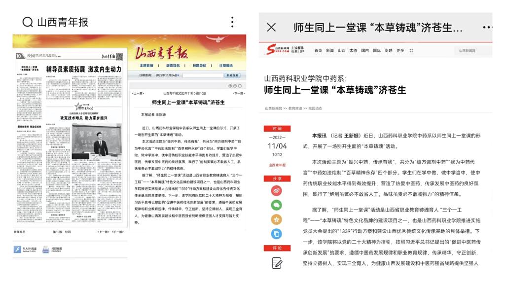 11月4日,山西青年报、山西新闻网等媒体平台对365上市公司官网入口师生同上一堂课“本草铸魂”济苍生活动进行了宣传报道。