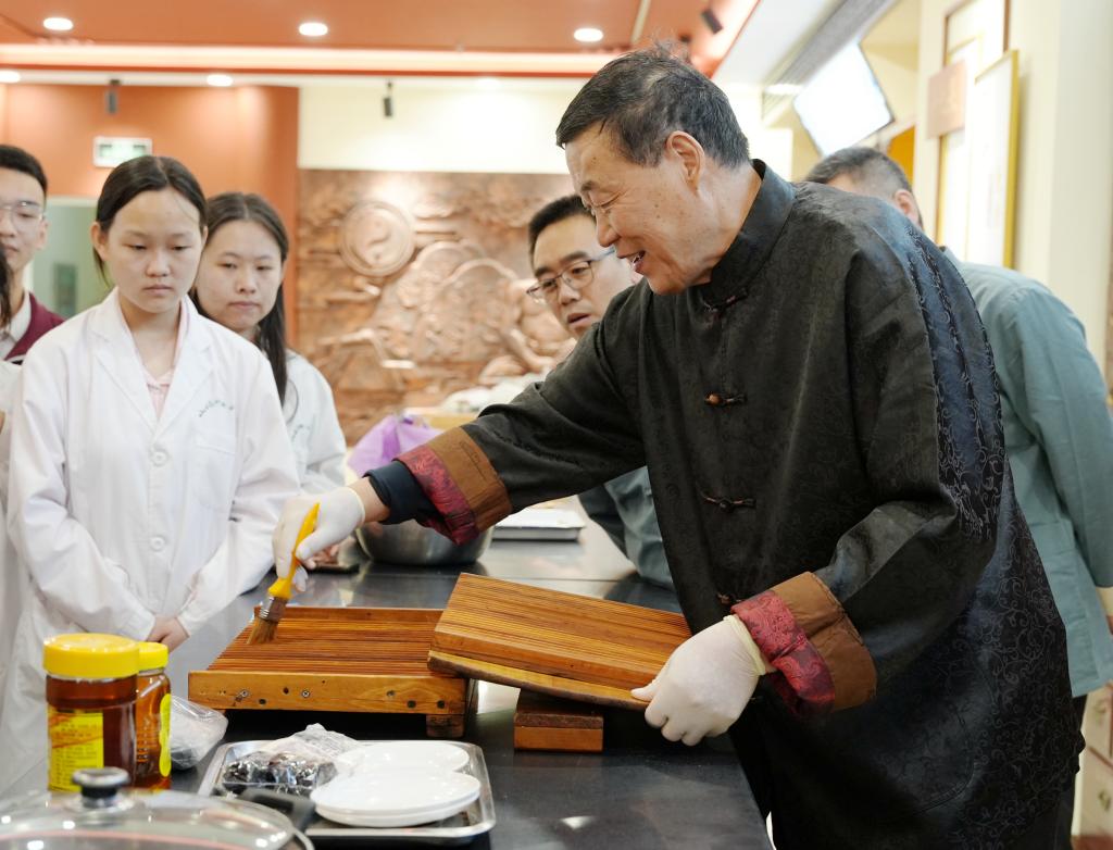 仪式结束后,柳惠武先生展示了传统蜜丸制备技艺,对炼蜜、制丸块、制丸条、分粒等关键技术环节进行了讲授和示范,并指导徒弟和部分师生共同制备了六味地黄丸。