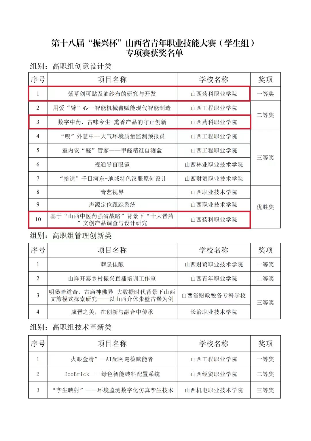 金秋菊香,硕果盈枝。近日,由共青团山西省委、山西省教育厅、山西省人力资源和社会保障厅共同主办的第十八届“振兴杯”山西省青年职业技能大赛(学生组)在太原落下帷幕,365上市公司官网入口参赛队伍团结协作、顽强拼搏,在众多参赛队伍中脱颖而出,取得优异成绩。其中,“紫草创可贴及油纱布的研究与开发”项目荣获一等奖,“数字中药,古味今生——熏香类产品的守正创新”项目荣获二等奖,“‘十大晋药’文创产品调查与研究设计”荣获优胜奖。
