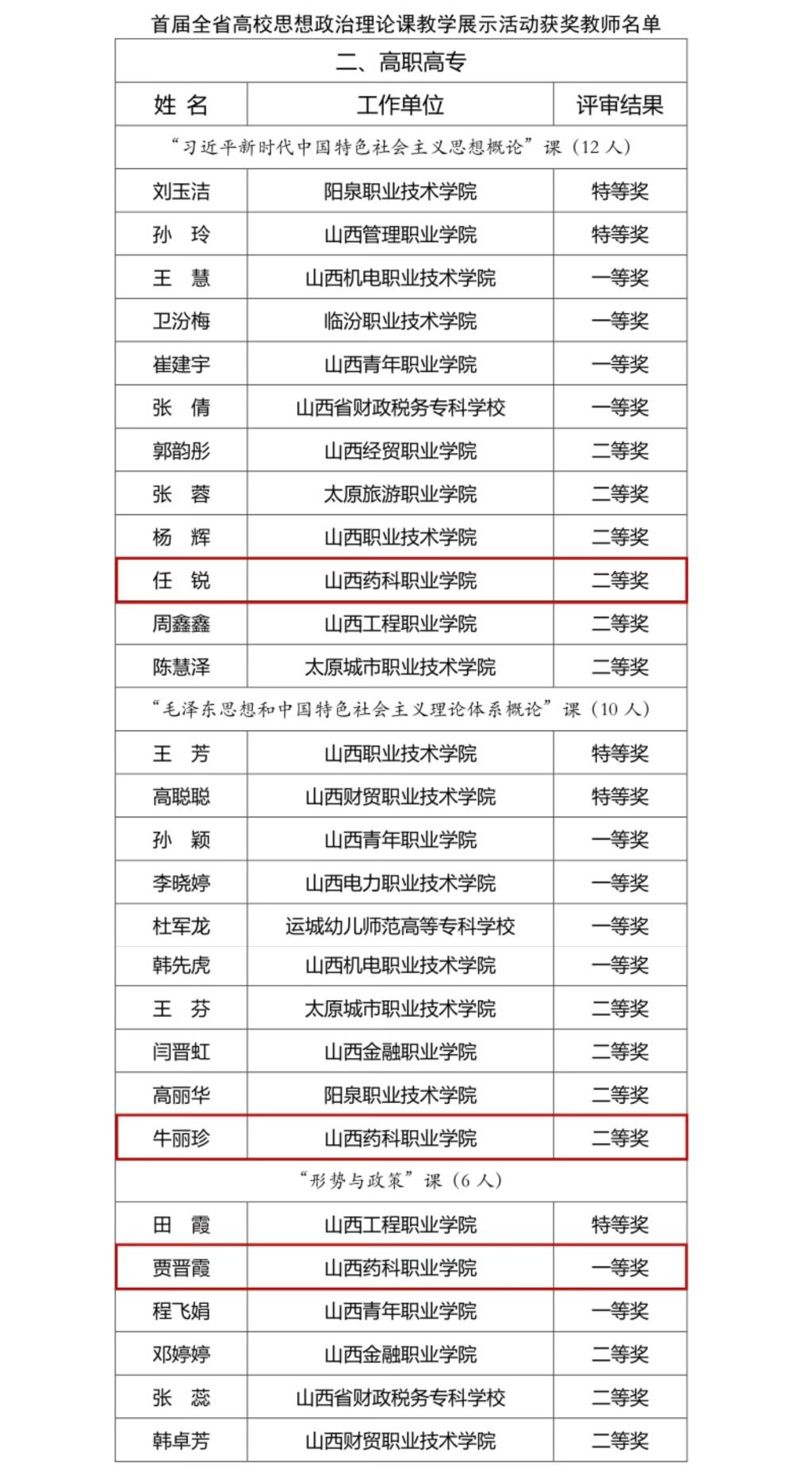 为深入学习贯彻习近平新时代中国特色社会主义思想和党的二十大精神,深化高校思政课改革创新,近日,山西省教育厅举办了首届全省高校思想政治理论课教学展示活动,经各高校推荐申报、专家初评、现场教学展示评审、结果公示等环节,365上市公司官网入口思政部教师贾晋霞获“形势与政策”课一等奖、任锐获“习近平新时代中国特色社会主义思想概论”课二等奖、牛丽珍获 “毛泽东思想和中国特色社会主义理论体系概论”课二等奖。