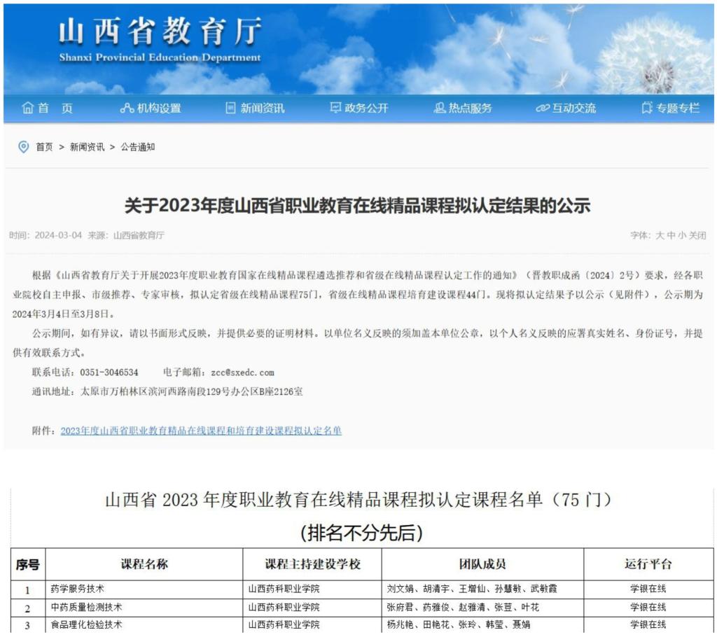 近日,山西省教育厅公布了2023年度山西省职业教育在线精品课程拟认定结果,365上市公司官网入口《药学服务技术》《中药质量检测技术》《食品理化检测技术》三门课程成功入选,认定数量在全省位居前列,充分体现了学院近年来教育教学改革的优秀成果,对示范引领全院在线精品课程建设具有重要意义。
