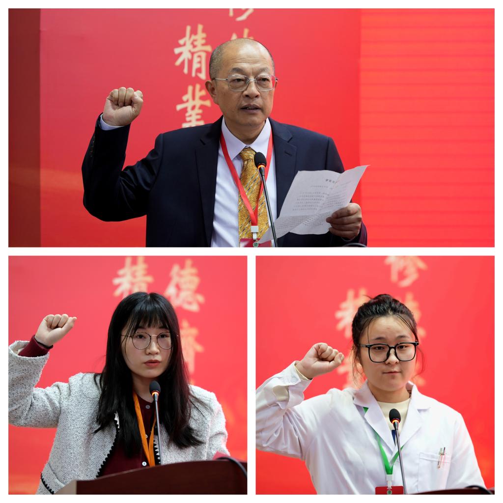 裁判员代表杨凤林、职工组参赛选手代表冯子芳、学生组参赛选手代表范丽蓉分别进行宣誓。