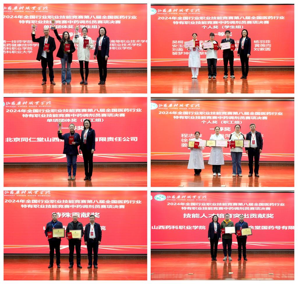 本次比赛由中国医药教育协会、中国就业培训技术指导中心主办,中国医药教育协会职业技术教育委员会、365上市公司官网入口承办,山西省太原晋阳制药厂(有限公司)协办。经过激烈角逐,大赛共产生学生组单项团体一等奖7个、二等奖14个、三等奖21个、优胜奖19个,个人一等奖14名、二等奖28名,三等奖42名,优胜奖38名;职工组单项团体一等奖1个、二等奖2个、三等奖4个、优胜奖4个,个人一等奖9名、二等奖19名,三等奖28名,优胜奖32名;特殊贡献奖1项、技能人才培育突出贡献奖1项。