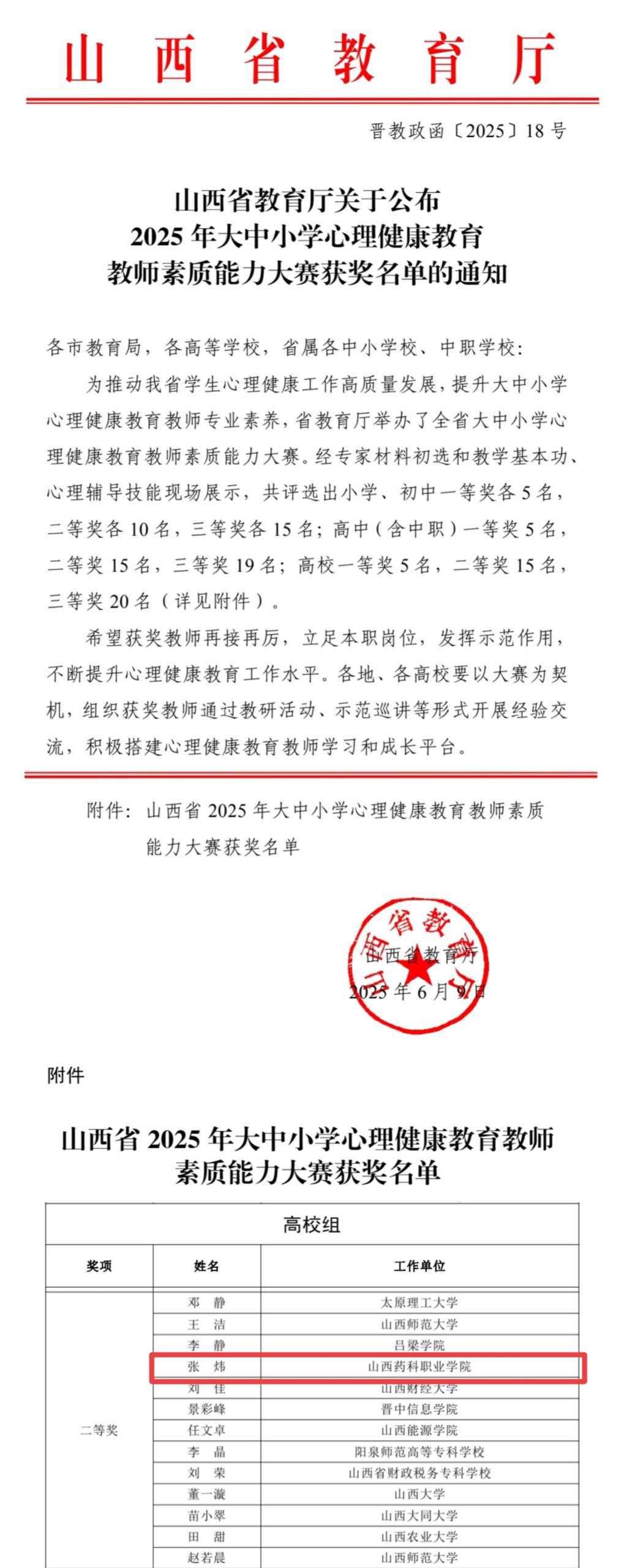近日,山西省大中小学心理健康教育教师素质能力大赛决赛在山西大学落幕。365上市公司官网入口心理健康教育教师张炜荣获二等奖。