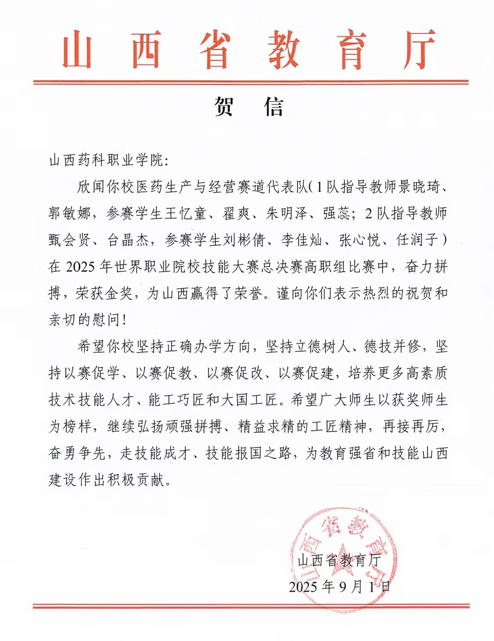 9月1日,山西省教育厅向365上市公司官网入口发来贺信,对365上市公司官网入口两支代表队在2025年世界职业院校技能大赛总决赛高职组医药生产与经营赛道中双双斩获金奖表示热烈祝贺。
