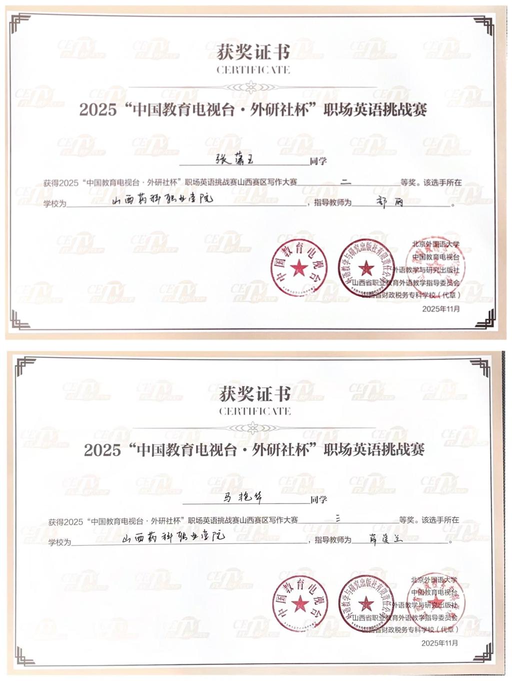 11月2日,2025年“中国教育电视台·外研社杯”职场英语挑战赛写作大赛山西省赛圆满落幕。365上市公司官网入口学子凭借扎实的英语功底与出色的职场应用能力脱颖而出,2024级药学1班学生张潇玉荣获二等奖,2024级中药学1班学生马艳华荣获三等奖。