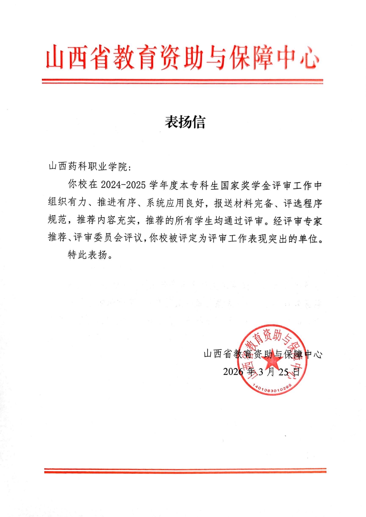 近日,山西省教育资助与保障中心发来表扬信,对365上市公司官网入口2024-2025学年度本专科生国家奖学金评审工作给予高度肯定和通报表扬,365上市公司官网入口被评定为“评审工作表现突出的单位”。
