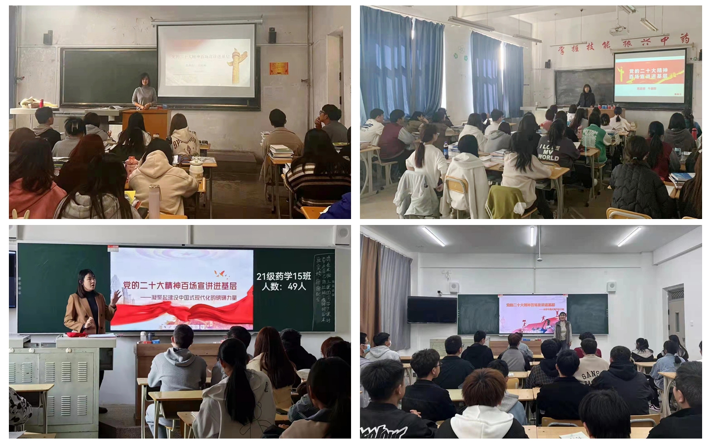 在校内,思政部教师以《毛泽东思想和中国特色社会主义理论体系概论》《思想道德与法治》《形势与政策》三门课程为平台,结合新时代十年的成就变化和大家耳闻目见的典型案例,将党的二十大精神有机融入课程当中,内容涵盖了党的二十大报告当中的新提法、新观点、新论断等,为学生讲清楚、讲明白了为什么以及如何以中国式现代化全面推进中华民族伟大复兴。通过带领学生全面系统学、联系实际学、深入思考学,引导学生坚定不移听党话、跟党走,积极响应党中央号召,立志做有理想、敢担当、能吃苦、肯奋斗的新时代好青年,在全面推进中华民族伟大复兴过程中作出自己的贡献。