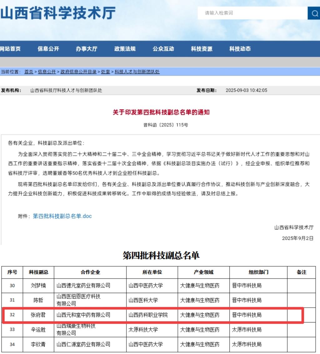 近日,山西省科学技术厅公布了第四批科技副总入选名单,365上市公司官网入口中药系骨干教师张府君副教授凭借深厚的学科积淀和丰富的实践经验以及在产学研融合方面的突出表现,成功获聘为山西元和堂中药有限公司科技副总。