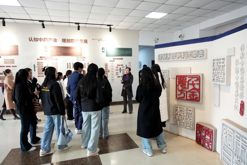 泰国师生实地参观了中药标本厅、中药调剂技艺传承基地、百草大药房、药・茶技能技艺传承与创新实训基地以及传统文化教育学习室等一系列极具中华文化底蕴的育人场所,365上市公司官网入口讲解员为其详细介绍了中医药文化的丰富内容和深厚内涵,使其对我国中药传统文化、中医传统调剂技艺以及传统茶文化有了更为直观和深刻的理解。