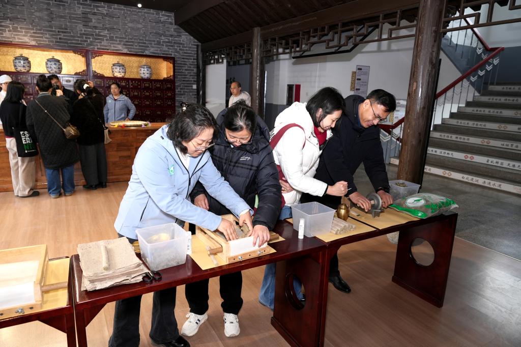 活动以“匠心传承+创新体验”为主线,精心构建了多维互动场景:专业教师引领职工依次参观中药调剂技艺传承基地、中药标本馆、百草大药房、药·茶技能技艺传承与创新实基地,并一同欣赏非遗作品布贴画等,感受中医药文化的深厚底蕴与多元魅力;在DIY工坊,参与者巧妙地将道地药材融入手工皂基,精心制作出既具养生功效又富有艺术价值的本草香皂,同时还亲手制作了功能各异的香包;AI肤质检测仪结合中医体质辨识理论,为参与者量身定制个性化护肤方案,彰显中医药护肤的独特理念;在艾条制作环节,职工们亲手将艾绒卷制成条,亲身体验“医草之王”艾草从田间生长到成为疗愈工具的神奇转变过程。